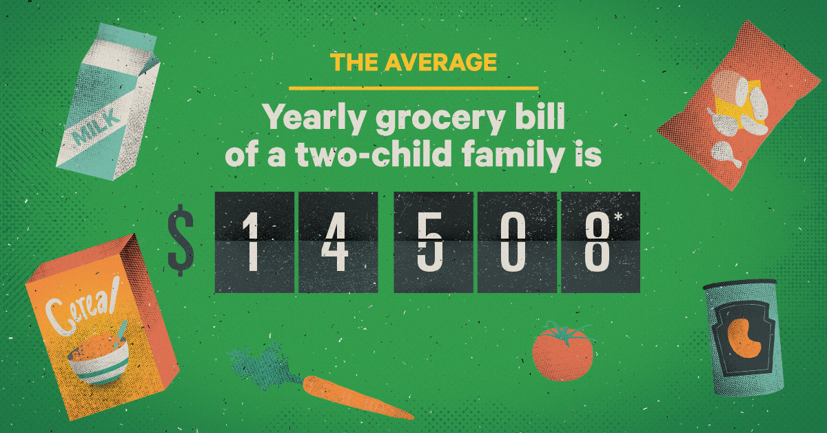 * The yearly grocery bill of a two child family is $14508. Based on a weekly average grocery spend for Couple with kids over age of 5 at $279 per week according to Moneysmart